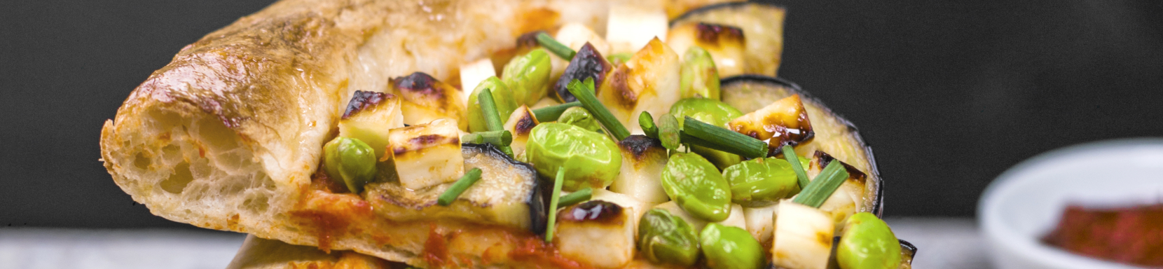 - Spread the aubergine evenly across the base, sprinkle with the edamame beans and paneer cheese.